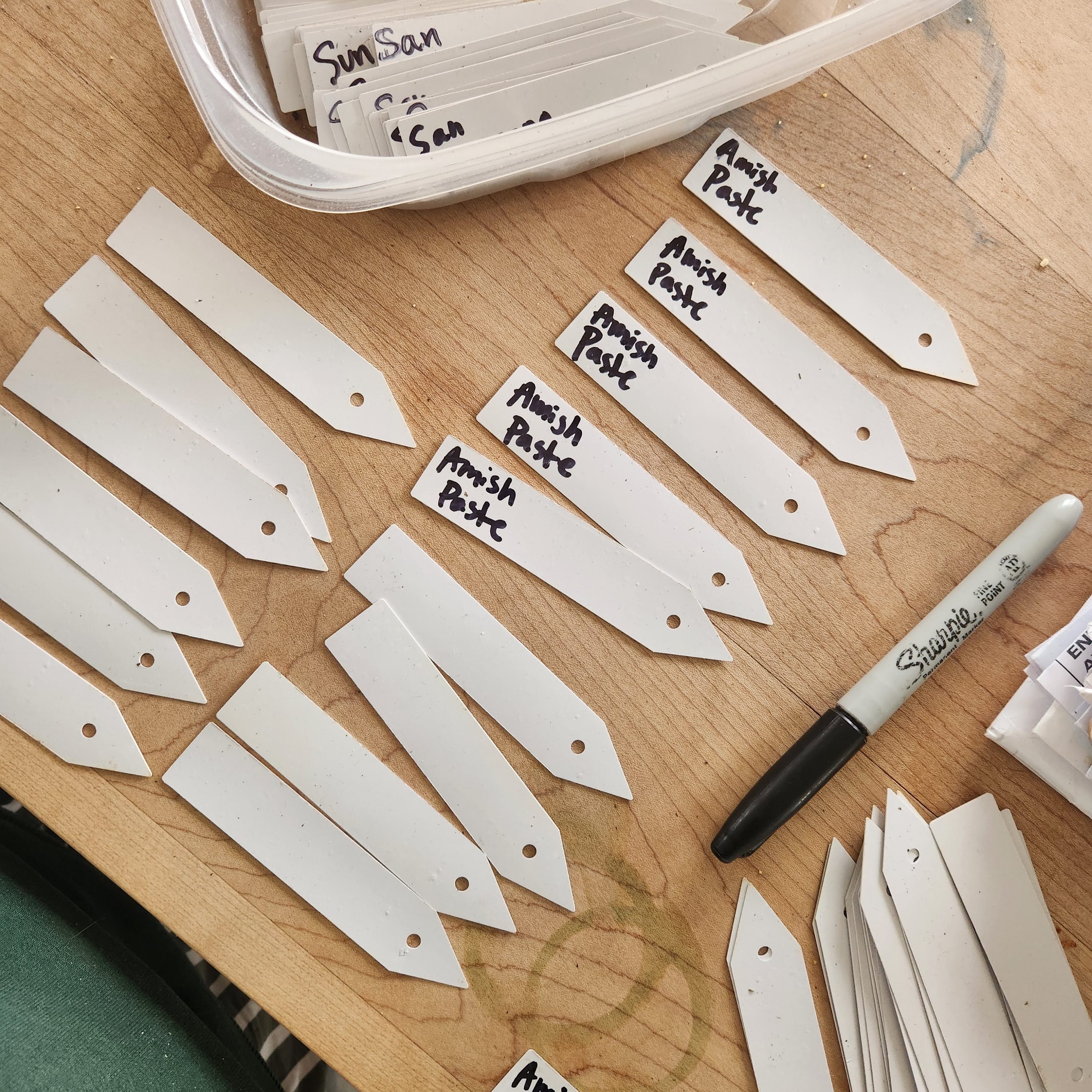 Label your containers or trays, and label them well! I have tried all kinds of ways of labeling: tape on the sides of trays, numbering rows and writing in a notebook, wood popsicle sticks that lets the marker bleed etc. Nothing beats getting a plastic tag with a sharpie marker! I have had too many “mystery” trays that I couldn’t sell in my farmstand, because I thought I could remember the varieties that were in there ~ and then immediately forgot. If you are concerned about plastics you can always wash and reuse them year after year.